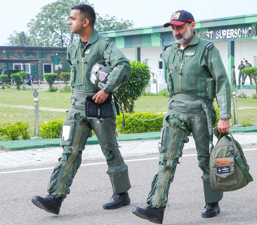 Air Chief Marshal Amar Preet Singh (R) and Flight Lieutenant Parvinder Singh before embarking on a combat sortie on a MiG-29UPG. (Photo: IAF)