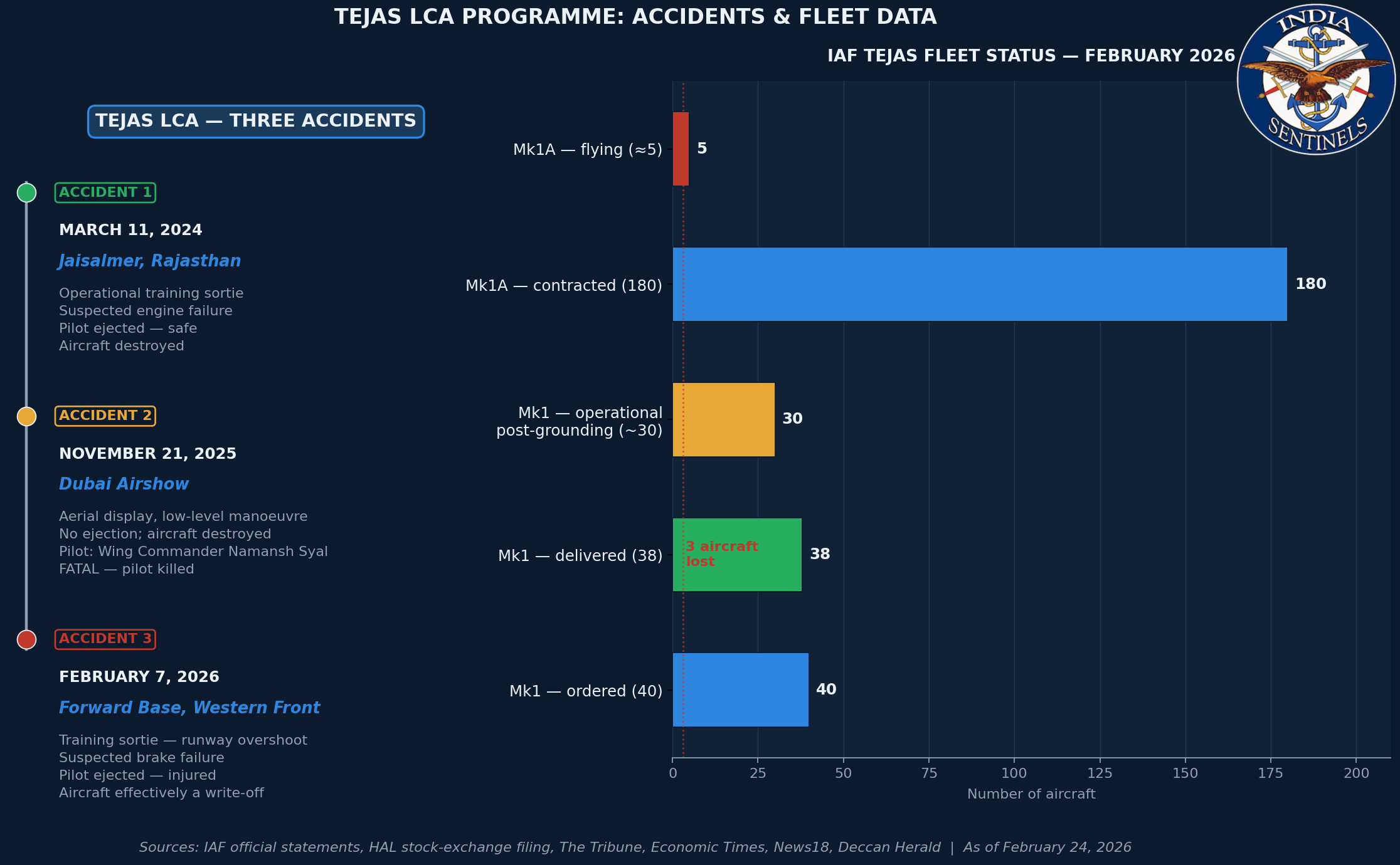 Each of the three losses occurred in a different operational context – a training sortie inland, an international airshow display, and a forward-base operation on the western front – and involved different suspected failure modes: engine failure at Jaisalmer, apparent loss of control at Dubai, and a brake or undercarriage failure on February 7. The variety of contexts argues against any single, glaring design defect spanning all three.